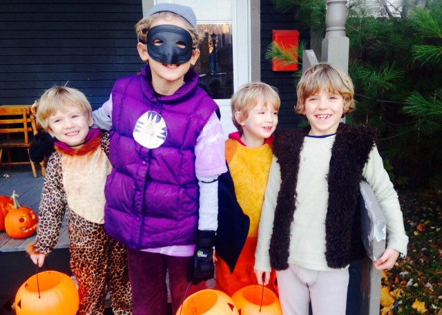 from left you have Netta as a leopard, Arthur as an all purple “skater dude”, Bailey as a lion and Lewis as Hiccup from the movie how to train your Dragon. Arthur’s outfit is this weird hodgepodge of stuff he wanted to do, he even drew some sort of symbol and taped it onto his front. He was so proud of his outfit. We had a lovely time at Jessica’s cousin’s house with their cute kids trick-or-treating in a fancier your neighborhood. Happy Halloween!