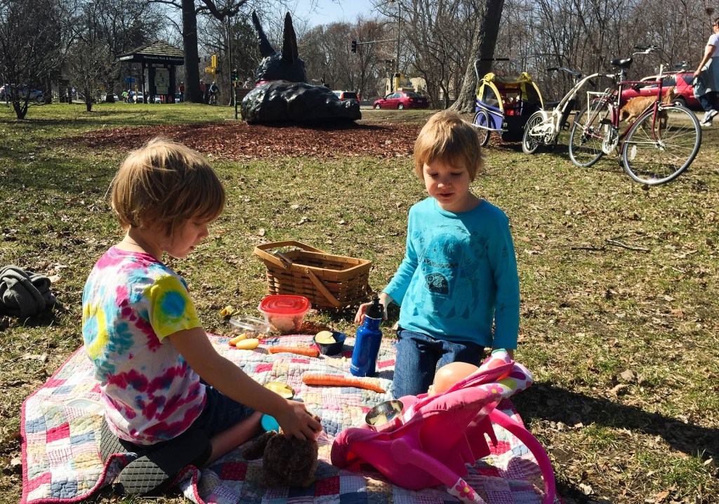 The other day the girls and I rode our bikes a few blocks south the Minnehaha Creek for a picnic. I wasn’t planning on much until Netta came downstairs with a beautifully packed basket with a carefully folded blanket inside. It turned out to be quite a proper little experience, complete with a pretend baby and owl. Lovely.