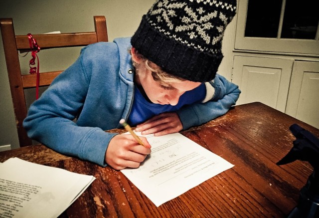 Up to fourth grade Art and Lewis went to Barton Open school, a progressive education school that never sent homework home with the kids. But their new school, Keewaydin, is a little more traditional. Here’s a photo of Art doing his first ever homework.