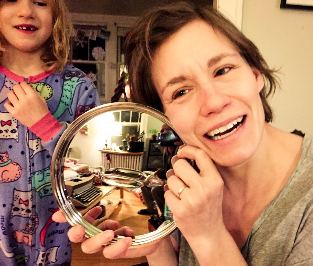 | Jessica with her favorite gift, a long-missing All Clad pot lid. |
