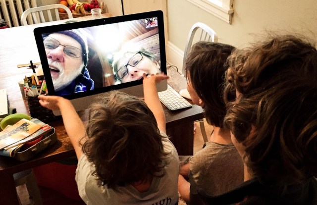 | The kids talking with Tim and Cynthia on the new iMac. |
