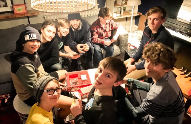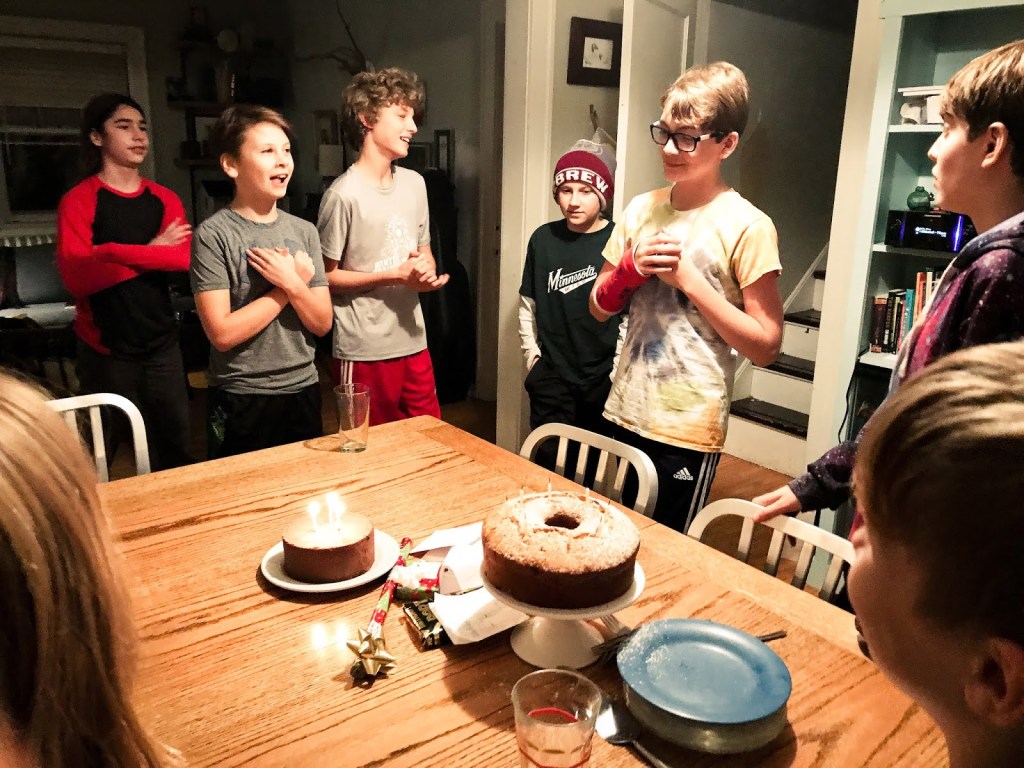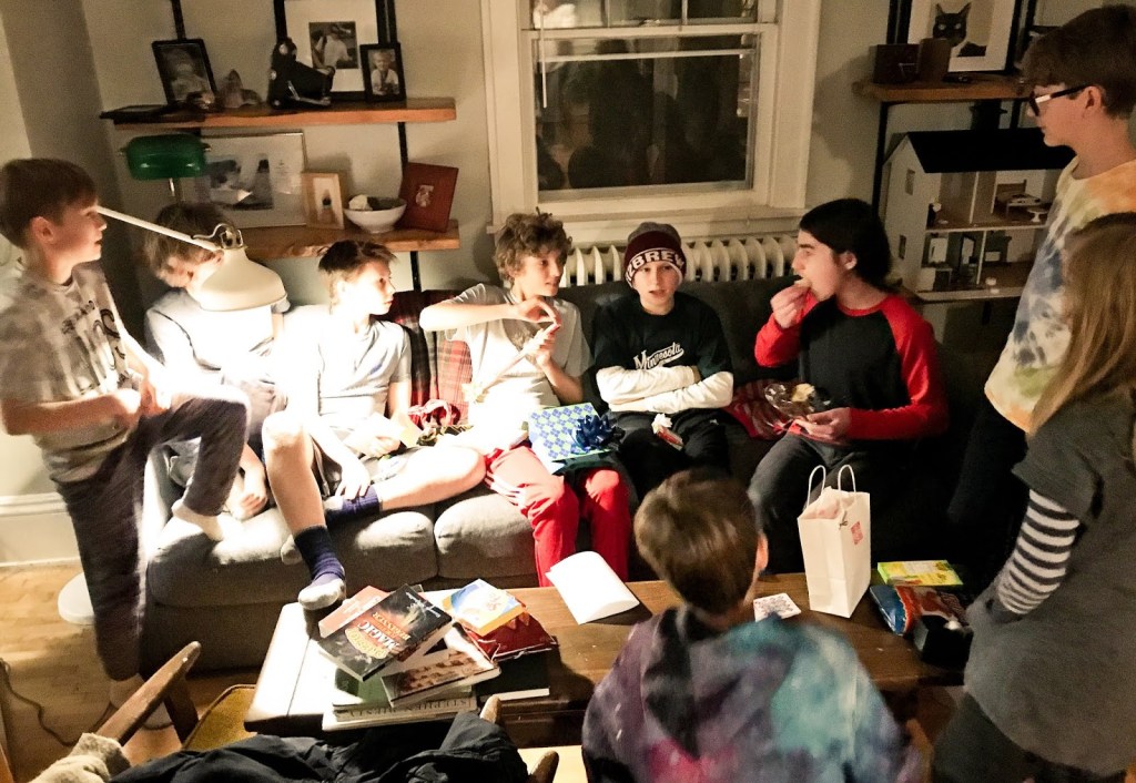 This year Art had a bunch of friends over for pound cake and flashlight tag in the woods. However this year he asked for ‘edible gifts’ and got a CRAPTON of unpleasant hot takis and candy. Last night when tucking him in he said, “Papa? If you need anything sweet, I can help. I’m your guy.” He’s rolling in it.